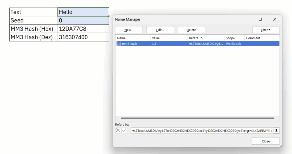=LET(dx;LAMBDA(x;y;LET(x;DEC2HEX(HEX2DEC(x);8);y;DEC2HEX(HEX2DEC(y);8);erg;MAKEARRAY(1;8;LAMBDA(z;s;DEC2HEX(BITXOR(HEX2DEC(MID(x;s;1));HEX2DEC(MID(y;s;1))))));CONCAT(erg)));dwm;LAMBDA(x;y;LET(x;DEC2HEX(HEX2DEC(x);8);y;DEC2HEX(HEX2DEC(y);8);bs;CONCAT(MAP(SEQUENCE(LEN(y));LAMBDA(v;HEX2BIN(MID(y;v;1);4))));erg;REDUCE(0;MAKEARRAY(1;LEN(bs);LAMBDA(z;s;MID(bs;s;1)));LAMBDA(a;z;MOD(IF(z="1";a*2+HEX2DEC(x);a*2);4294967296)));DEC2HEX(erg;8)));dwsr;LAMBDA(x;y;LET(x;DEC2HEX(HEX2DEC(x);8);bs;REPT("0";y)&LEFT(CONCAT(MAP(SEQUENCE(LEN(x));LAMBDA(v;HEX2BIN(MID(x;v;1);4))));32-y);CONCAT(BIN2HEX((MAKEARRAY(1;LEN(bs)/4;LAMBDA(zz;ss;MID(bs;(ss-1)*4+1;4))))))));dwsl;LAMBDA(x;y;LET(x;DEC2HEX(HEX2DEC(x);8);bs;RIGHT(CONCAT(MAP(SEQUENCE(LEN(x));LAMBDA(v;HEX2BIN(MID(x;v;1);4))));32-y)&REPT("0";y);CONCAT(BIN2HEX((MAKEARRAY(1;LEN(bs)/4;LAMBDA(zz;ss;MID(bs;(ss-1)*4+1;4))))))));lm;LAMBDA(t;LET(erg;CONCAT(MAKEARRAY(1;LEN(t)/2;LAMBDA(z;s;MID(t;LEN(t)-(s-1)*2-1;2))));IF(LEN(erg)<8;REPT("0";8-LEN(erg))&erg;erg)));dwadd;LAMBDA(x;y;LET(x;DEC2HEX(HEX2DEC(x);8);y;DEC2HEX(HEX2DEC(y);8);DEC2HEX(MOD(HEX2DEC(x)+HEX2DEC(y);4294967296))));dwor;LAMBDA(x;y;LET(x;DEC2HEX(HEX2DEC(x);8);y;DEC2HEX(HEX2DEC(y);8);DEC2HEX(MOD(BITOR(HEX2DEC(x);HEX2DEC(y));4294967296))));mpb;LAMBDA(x;dwadd(dwm(dwor(dwsl(x;13);dwsr(x;19));5);"e6546b64"));ms;LAMBDA(x;dwm(LET(k;dwm(x;"cc9e2d51");dwor(dwsl(k;15);dwsr(k;17)));"1b873593"));mf;LAMBDA(text;cur;LET(hx;dwm(LET(h;dwm(dx(dx(cur;DEC2HEX(LEN(text);8));dwsr(dx(cur;DEC2HEX(LEN(text);8));16));"85ebca6b");dx(h;dwsr(h;13)));"c2b2ae35");dx(hx;dwsr(hx;16))));LAMBDA(text;[seed];IF(LEN(text)=0;0;mf(text;REDUCE(IF(seed<>"";seed;"00000000");MAKEARRAY(1;ROUNDUP(LEN(text)/4;0);LAMBDA(z;s;LET(part;MID(text;(s-1)*4+1;4);(CONCAT(MAP(SEQUENCE(LEN(part));LAMBDA(x;DEC2HEX(CODE(MID(part;x;1));2))))))));LAMBDA(a;x;IF(LEN(x)=8;mpb(dx(a;ms(lm(x))));dx(a;ms(lm(x))))))))))