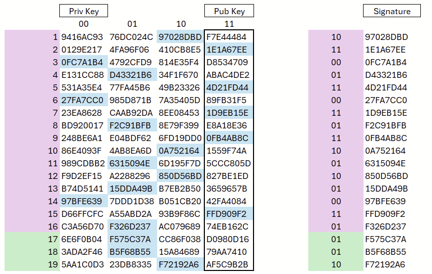 The four columns represent the bit combinations 00, 01, 10, and 11. To create the signature, the (hash of the) message is read two bits at a time: each pair of bits determines the corresponding column, and the associated hash value stored in that column is revealed.
