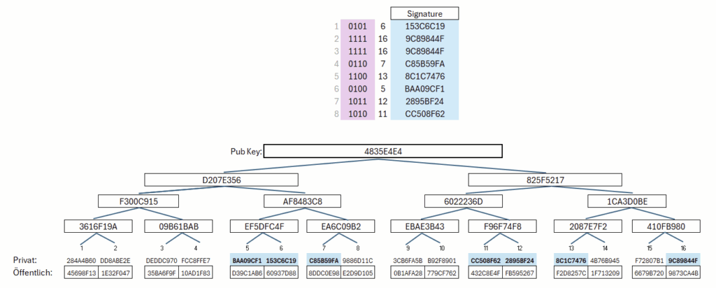 Without additional protection, however, very small manipulations (such as one- or two-bit changes) could go unnoticed. For instance, an attacker could change the bits in row 1 from 10 to 11 and replace the value 97028DBD with the public-key value F7E44484 — the verification would not detect this. For this reason, the signature is augmented with a checksum. Put simply: if a value in one chain is shifted to the right, a corresponding shift to the left must occur elsewhere. An attacker cannot determine this counter-shift, since only the values further to the right are known to them, and the required earlier chain values cannot be computed backwards. This ensures that even single-bit modifications cannot go undetected. Figure 6 shows a WOTS signature including the checksum.