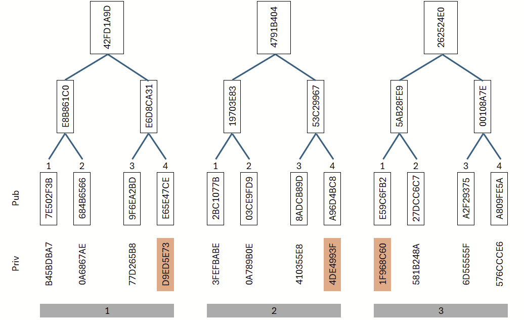 This results in the following assignments: Tree 1 → Leaf 4, Tree 2 → Leaf 4, Tree 3 → Leaf 1. Each tree corresponds to a Merkle tree: from a set of secret (private) values, public values are derived using a hash function and organized in a tree structure. Let us first examine these three trees in detail (Figure 11): in the first two trees, the fourth leaf was selected, and in the third tree, the first leaf. For these selected leaves, the corresponding private keys are revealed.