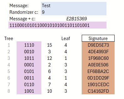 The concepts presented here have been implemented in Excel as an illustrative example. In the demo, however, the linking of layers using WOTS+ was omitted for obvious reasons. The path through a four-layer hypertree is computed and displayed, as well as the creation of the signature using FORS with five trees.